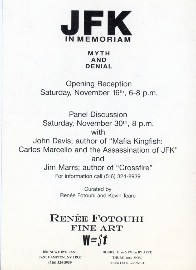 JFK in Memoriam: Myth and Denial, Group Show with Leon Golub, Kiki Smith, Larry Clark, Renée Fotouhi Fine Art, Card, 1991