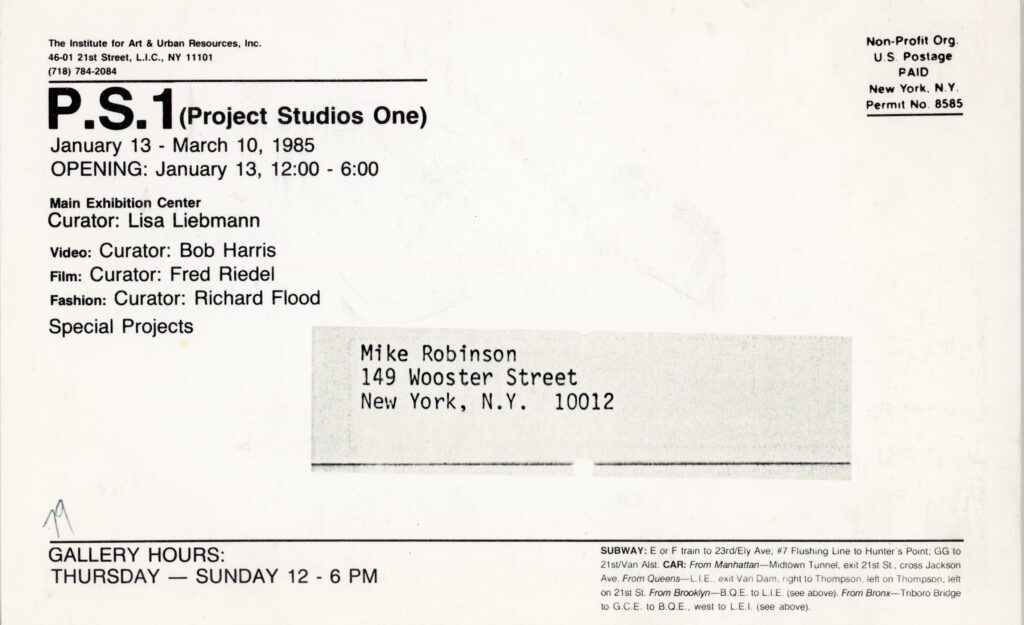 P.S.1 (Project Studies One), Winter Opening, Card, 1985