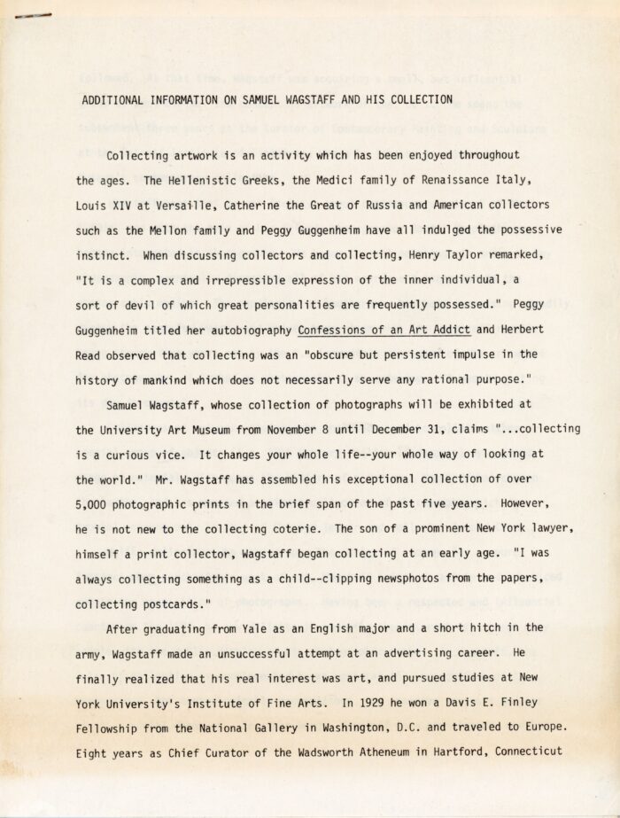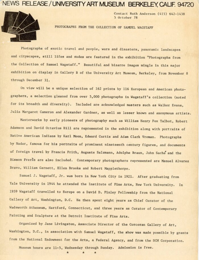 University Art Museum (Berkeley, California), Photographs from the Collection of Sam Wagstaff, press release and 6-page information sheet, October 5, 1978.