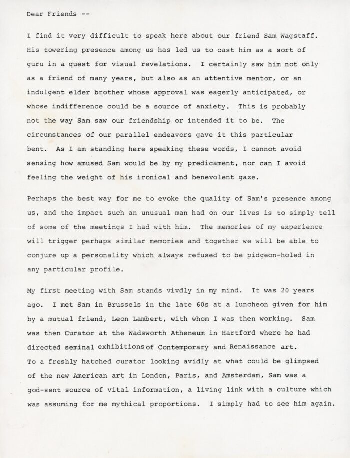 Speech by Pierre Apraxine read at Sam Wagstaff’s memorial, with letter to Anne MacDonald, March 16, 1987.