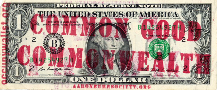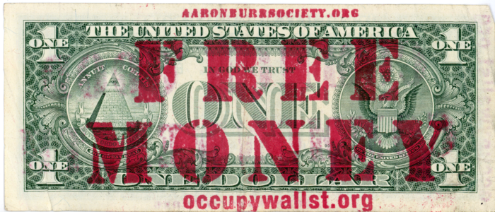 Aaron Burr Society (Jim Costanzo), Free Money Movement, Rubber Stamp on One Dollar Bill created at the time of Occupy Wall Street, 2011