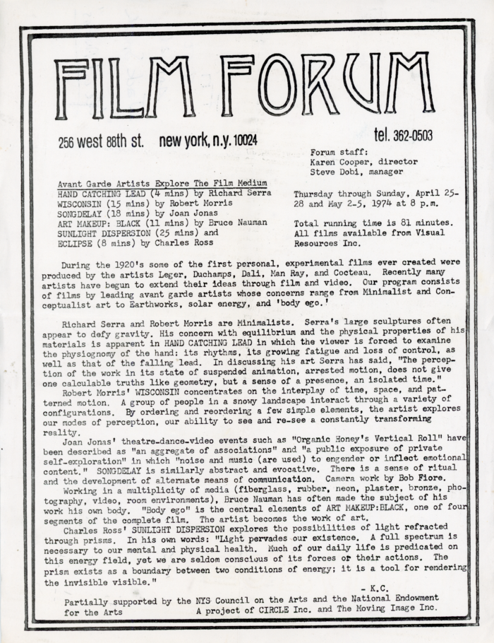 Avant Garde Artists Explore The Film Medium, with Richard Serra, Joan Jonas, Robert Morris, Bruce Nauman, Charles Ross, Film Forum, Flyer, 1974