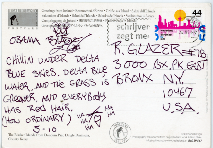 Blade, “Chillin Under Delta Blue Skies. Delta Blue Water. And the Grass is Greener. And Everybody Has Red Hair,” Postcard from Ireland, 2010