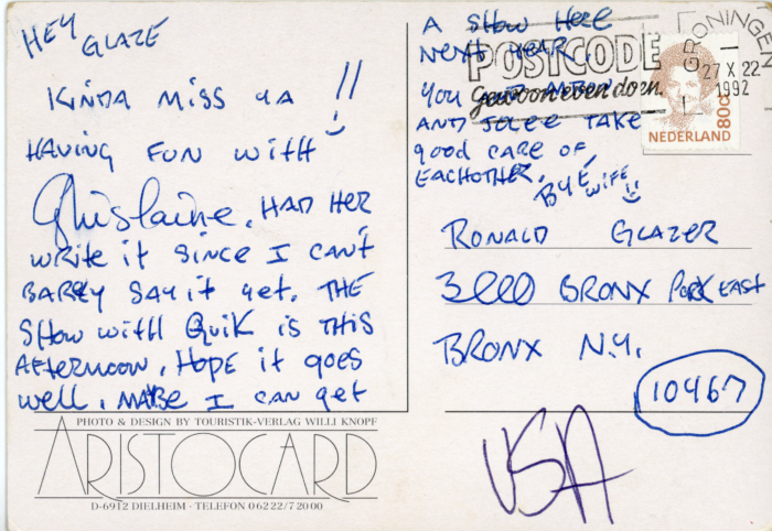 Blade, “The Show with Quik is This Afternoon… Maybe I Can Get a Show Here Next Year,” Postcard from Heidelberg (Germany) to Ronnie Glazer, 1992