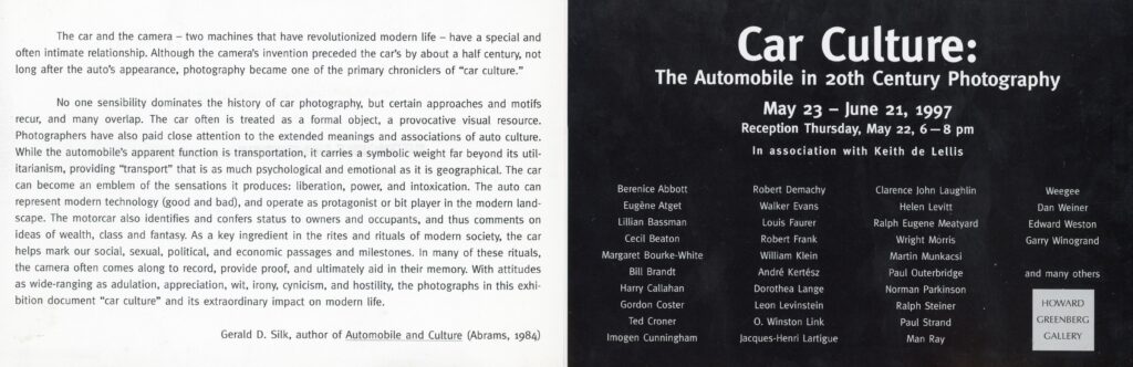 Car Culture: The Automobile in 20th Century Photography, Group Exhibition with Gary Winogrand, Weegee, Man Ray, Text by Gerald Silk, Howard Greenberg Gallery, Folded Card with Insert, 1997