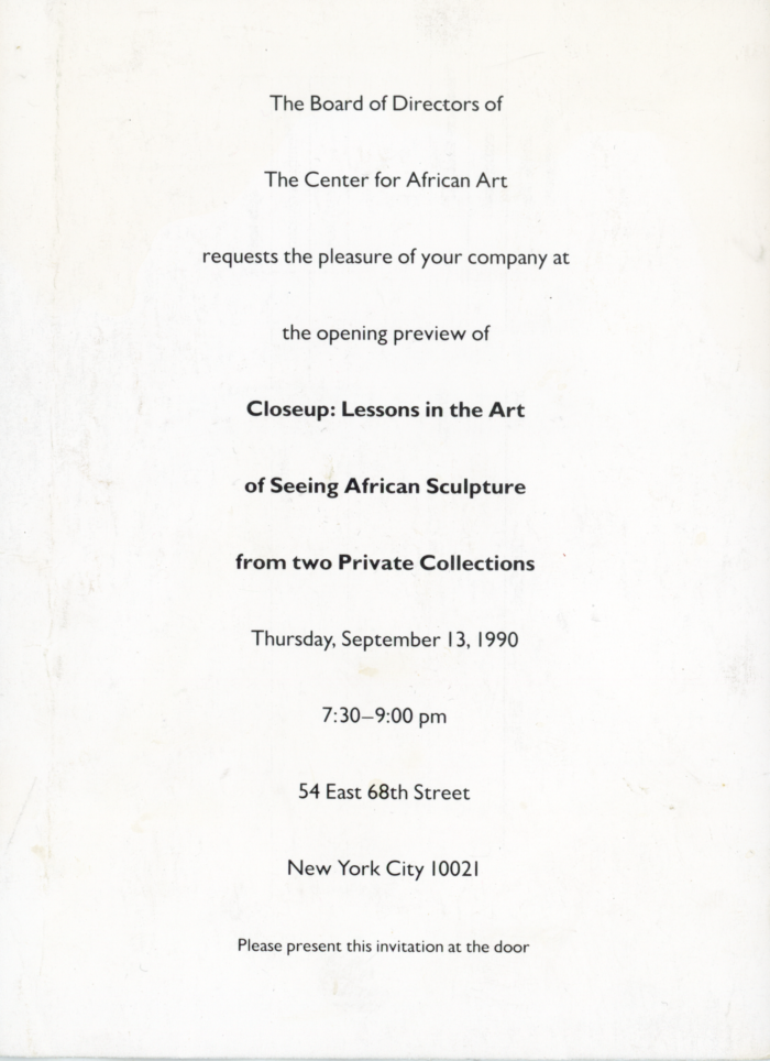 Closeup: Lessons in the Art of Seeing African Sculpture from two Private Collections, The Center for African Art, Card, 1990