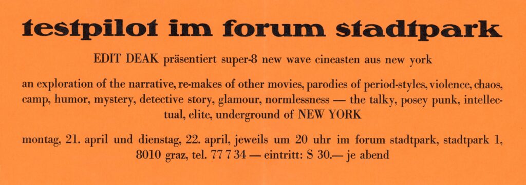 Edit DeAk, Test Pilot in the Forum Stadtpark: Super-8 New Wave Cineastes From New York, Forum Stadtpark (Austria), Folded Flyer, c. 1980