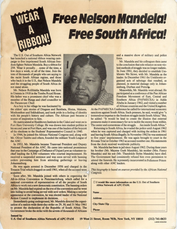 Free Nelson Mandela! Free South Africa, Flyer issued by U.S. Out of Southern Africa Network of APC/PAM, 1980s