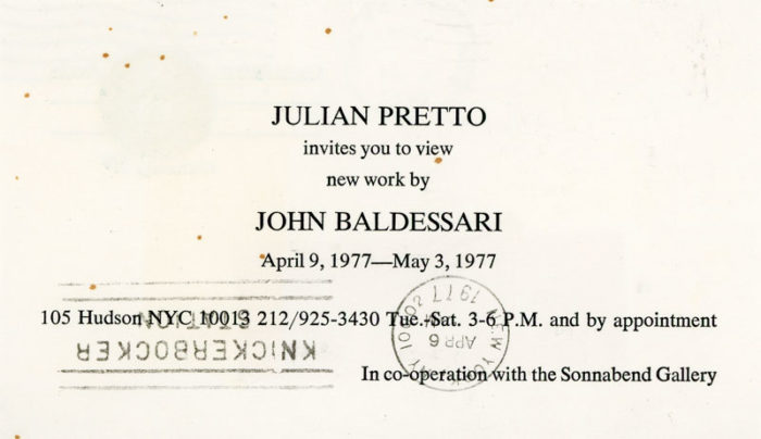 Postcard invitation to view new works by John Baldessari at Julian Pretto Gallery, 1977. In co-operation with Sonnabend Gallery.