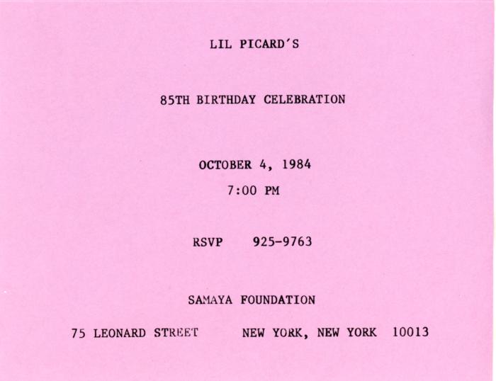 Lil Picard, 85th Birthday Celebration, Samaya Foundation, Folded Card, 1984