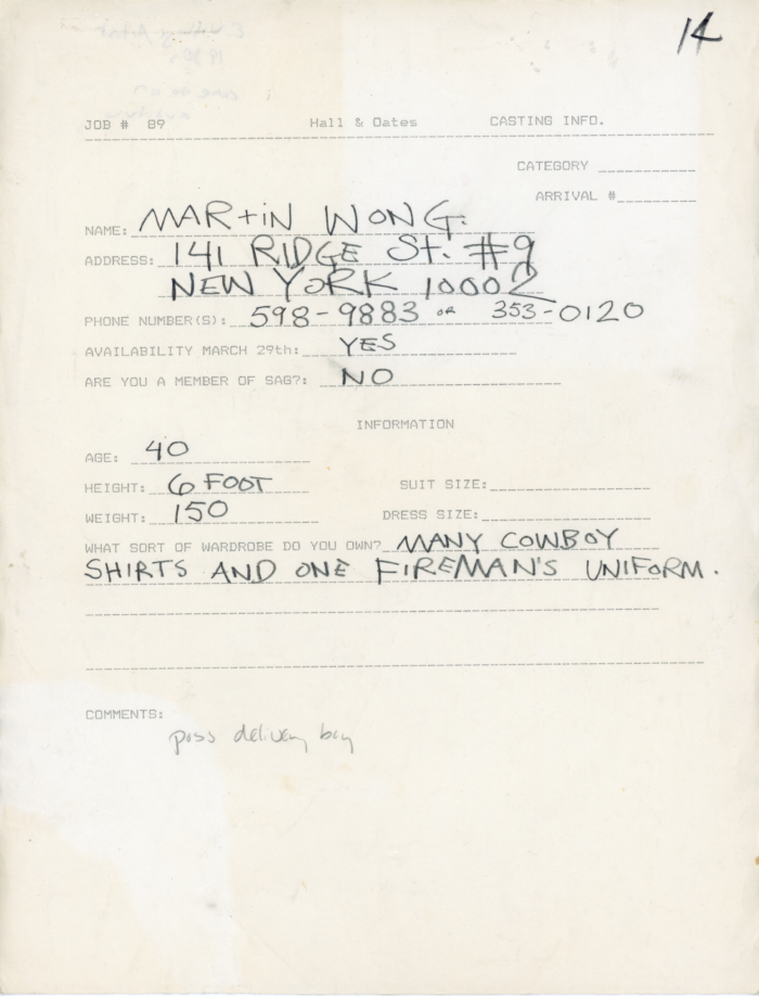 In 1986, Martin Wong came to an audition for a Hall & Oates music video. The production company took two polaroids and had him fill out a questionnaire/contact form.