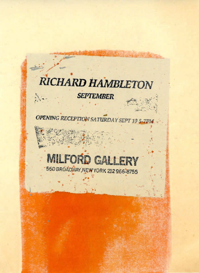 Announcement for the opening of Richard Hambleton’s exhibition, September, at Milford Gallery, September 10th, 1988.