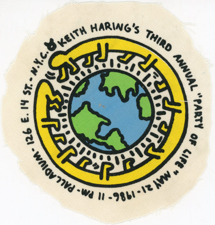 Palladium, Keith Haring’s Third Annual Party of Life, Cloth Cut-out, 1986. Circular piece of cloth cut from an article of clothing.