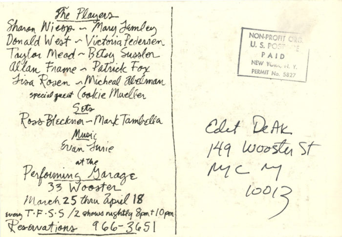 Performing Garage, Gary Indiana, Phantoms of Louisiana, Card, c. 1981. With special guest Cookie Mueller.