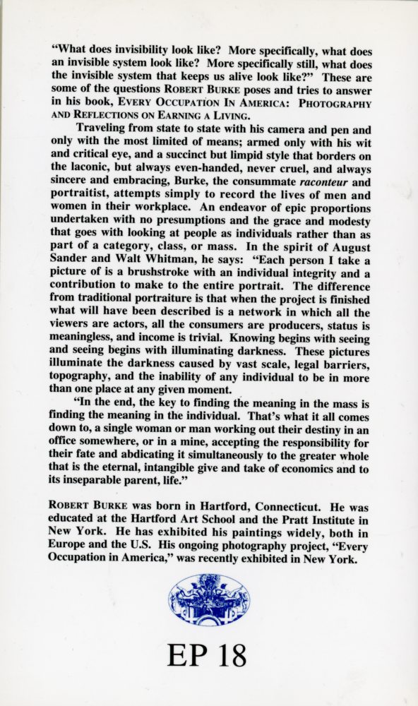 Robert Burke, Every Occupation in America: Photography and Reflections on Earning a Living, 99-Page Book with Exhibition Card, Dinter Fine Art Gallery, 2006
