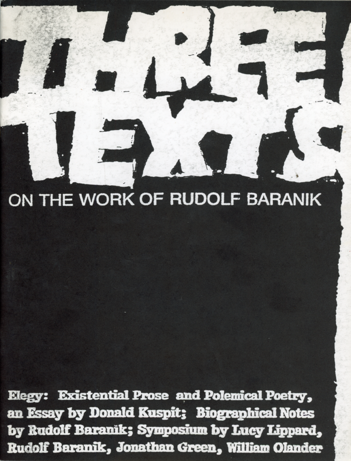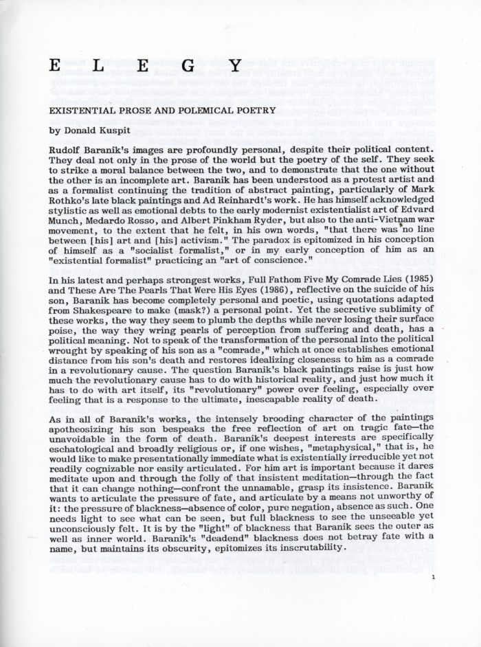 Elegy: Existential Prose and Polemical Poetry essay by Donald Kuspit; Biographical Notes by Rudolf Baranik; Symposium by Lucy Lippard, Rudolf Baranik, Jonathan Green, William Olander.