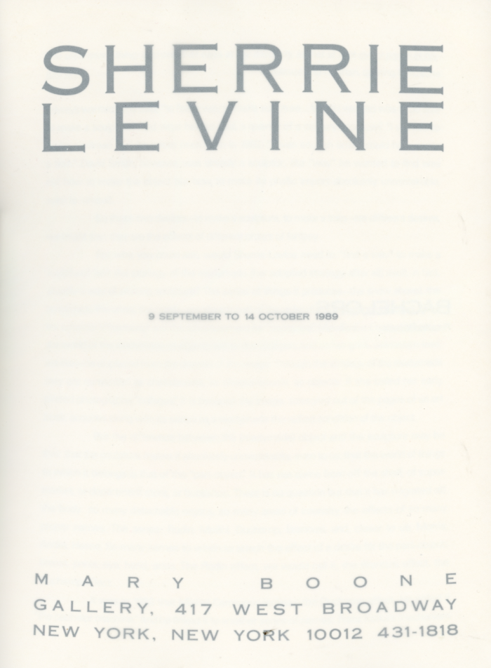 Sherrie Levine, Mary Boone Gallery, 28-Page Catalogue with Essay by Rosalind Krauss, 1989