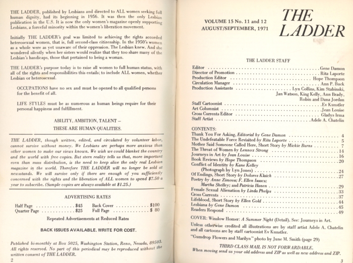 “The Ladder, published by Lesbians and directed to ALL women seeking full human dignity, had its beginning in 1956. It was then the only Lesbian publication in the U.S. It is now the only women’s magazine openly supporting Lesbians, a forceful minority within the women’s liberation movement.”
