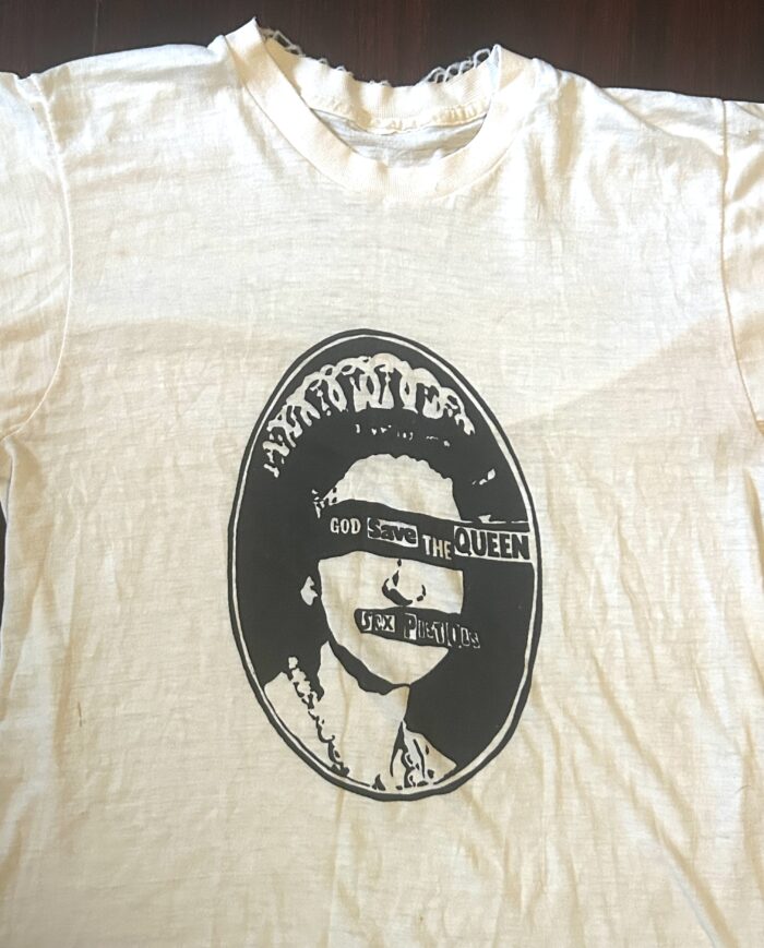 Extremely rare and original Sex Pistols God Save the Queen Tour t-shirt. Printed cotton fabric. Approx. 26 x 27 inches, size Small.