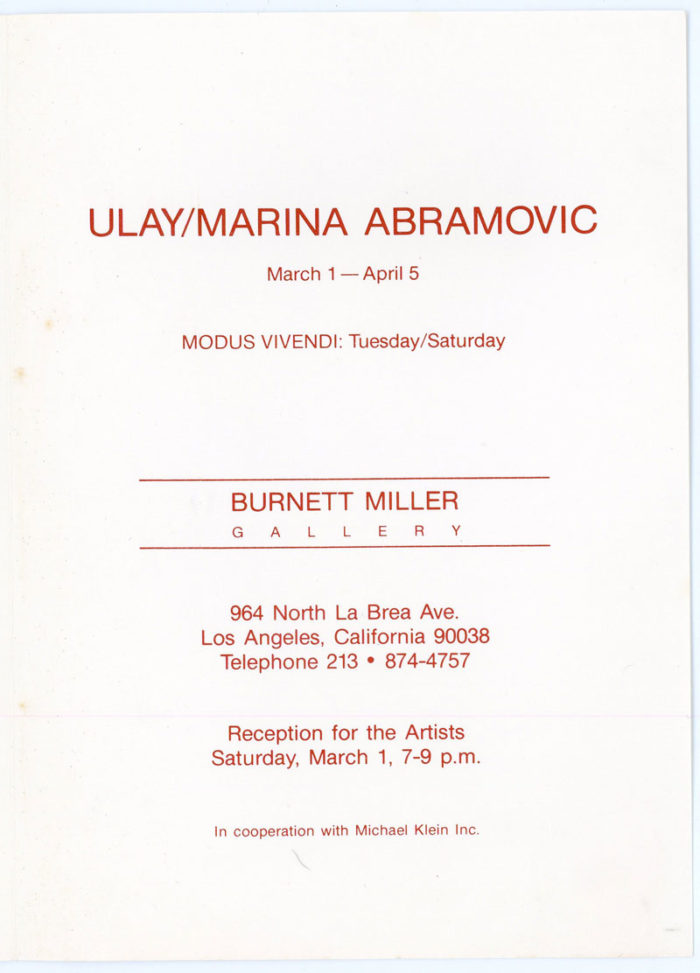 Folded Card for Ulay/Marina Abramovic exhibition at Burnett Miller Gallery, Los Angeles, 1986.