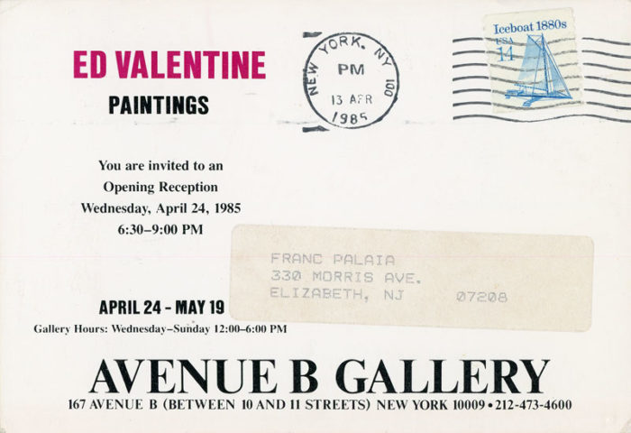 Postcard for Ed Valentine’s Paintings exhibition at Avenue B Gallery, 1985.