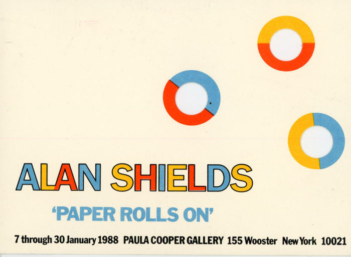 Unique card for Alan Shields’ exhibition Paper Rolls On at Paula Cooper Gallery, 1988.  There are circular cut-outs inside each colored circle.