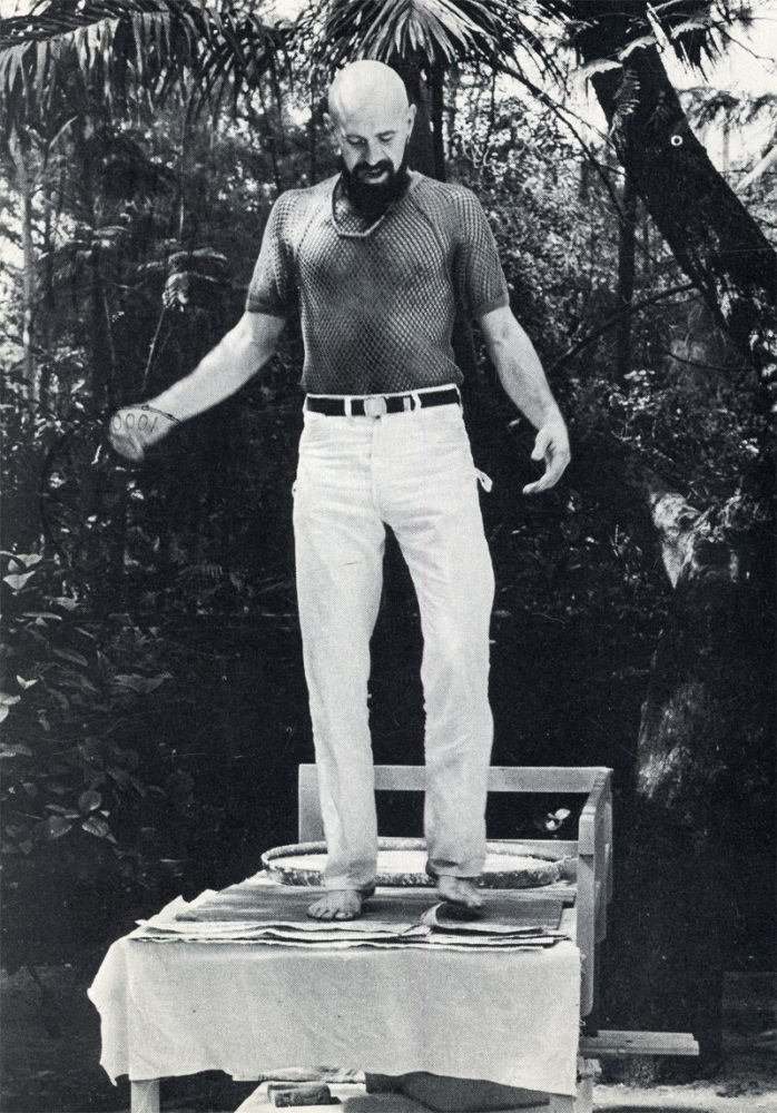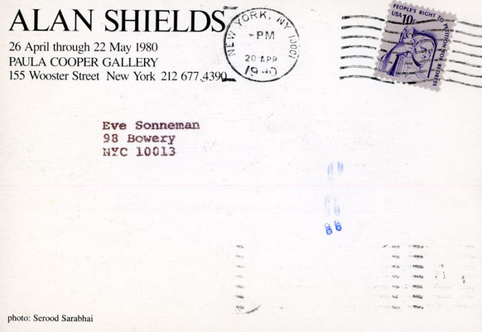 Postcard for Alan Shields’ exhibition at Paula Cooper Gallery. Front of card features a picture of the artist taken by Serood Sarabhai.