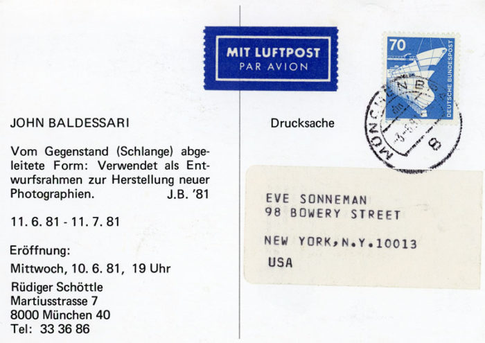 Postcard for John Baldessari’s exhibition at Rüdiger Schöttle Gallery, München, 1981.