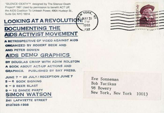 Postcard for Looking at a Revolution Documenting The AIDS Activist Movement, a retrospective of videos against AIDS organized by Robert Beck and Peter Bowen at Simon Watson Gallery, 1990. Features the Silence = Death design on the front of card.