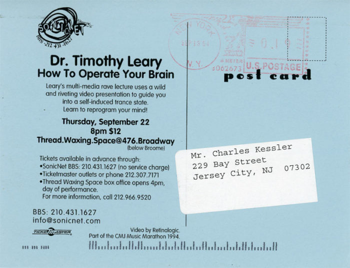 Postcard for Dr. Timothy Leary – How to Operate Your Brain, a multi-media lecture at the Thread Waxing Space, 1994.