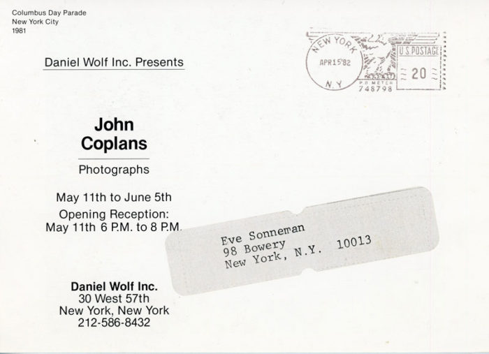 Postcard for John Coplans’ exhibition Photographs at Daniel Wolf Inc., 1982. Front of card features Coplans’ Columbus Day Parade, 1981.