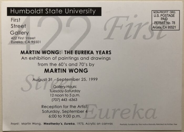Exhibition card for Martin Wong’s exhibition at Humboldt State University’s First Street Gallery, August – September 1999. Wong died a few weeks before the exhibition opened, on August 12, 1999.