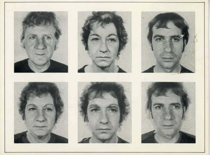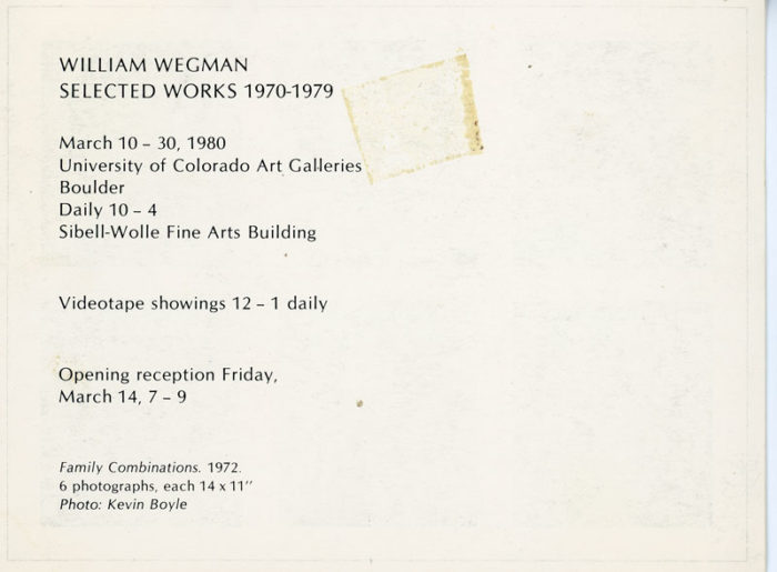 Postcard for William Wegman’s exhibition of Selected Works 1970-1979 at Sibell-Wolle Fine Arts Building at the University of Colorado Art Galleries, 1980. Front of card features Wegman’s Family Combinations, 1972.