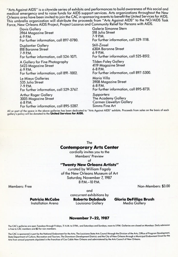 Contemporary Arts Center (New Orleans), Arts Against AIDS, Twenty New Orleans Artists, Folded Card, 1987