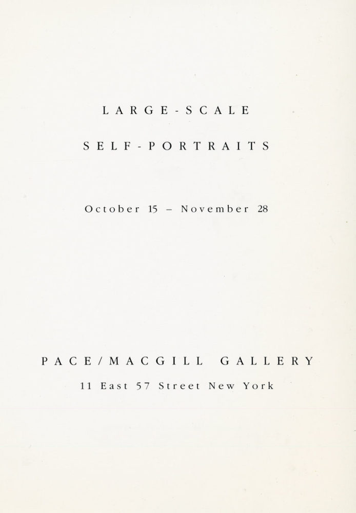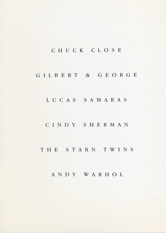 3-fold card for group show Large Scale Self-Portraits at Pace/MacGill Gallery, c. early 1980’s. Includes Chuck Close, Gilbert & George, Lucas Samaras, Cindy Sherman, The Starn Twins, and Andy Warhol. Front of card features Lucas Samaras’ Self Portrait, 1983.