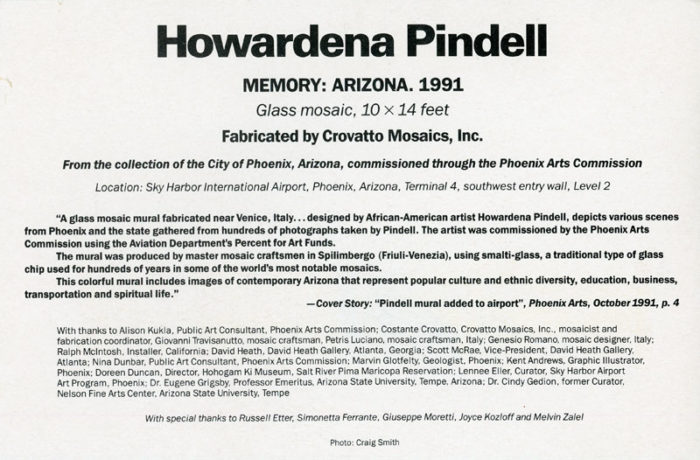 Card for Howardena Pindell’s 10′ x 14′ glass mosaic Memory: Arizona. 1991 installed in the Sky Harbor International Airport, Phoenix AZ. Photo of mosaic on card by Craig Smith.