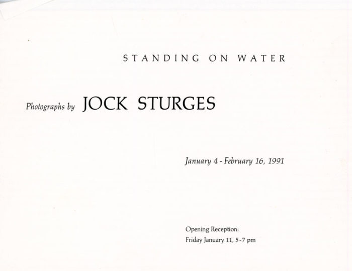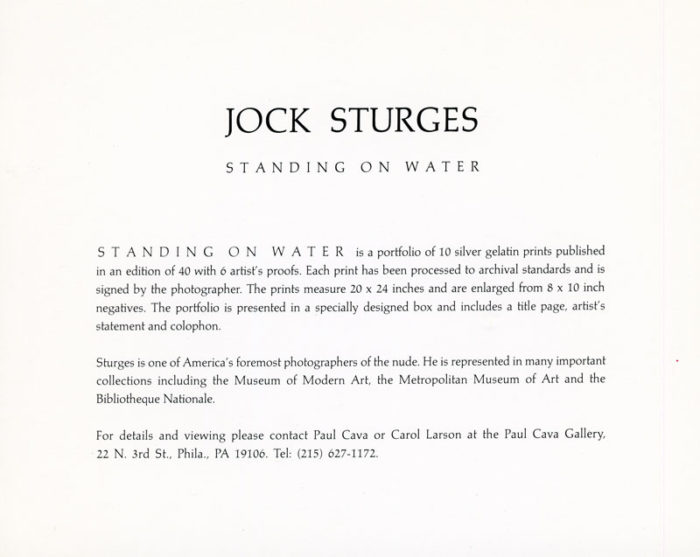Folded card with insert for Jock Sturges’ exhibition of a new 10-print portfolio Standing on Water, at Paul Cava Gallery, 1991. Front of card features Sturges’ Family DeSaxce, 1989.