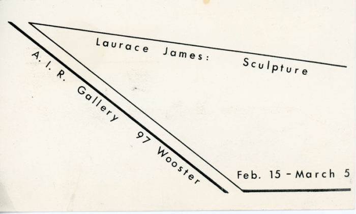 Card for Laurace James’ exhibition of Sculpture at A.I.R. Gallery, c. 1970’s. James was a founding member of A.I.R. Gallery, an all-female cooperative gallery founded in 1972.