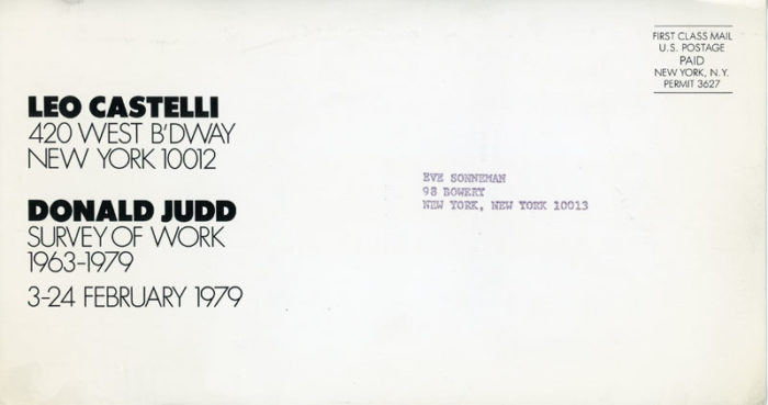 Card for Donald Judd’s exhibition Survey of Work 1963 – 79 at Leo Castelli Gallery, 1979.