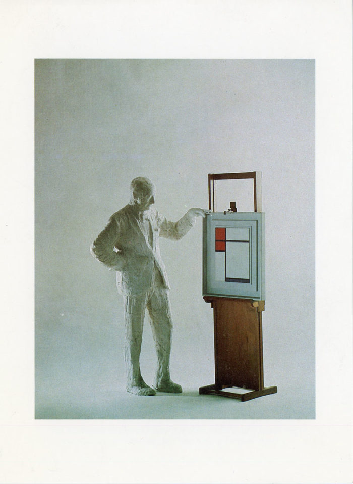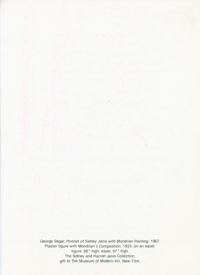 Folded card for Seven Daces of Twentieth Century Art from the Sidney and Harriet Janis Collection of The Museum of Modern Art and the Sidney Janis Gallery Collection at the Santa Barbara Museum of Art, 1980. Front of card features George Segal’s Portrait of Sidney Janis with Mondrian Painting, 1967.