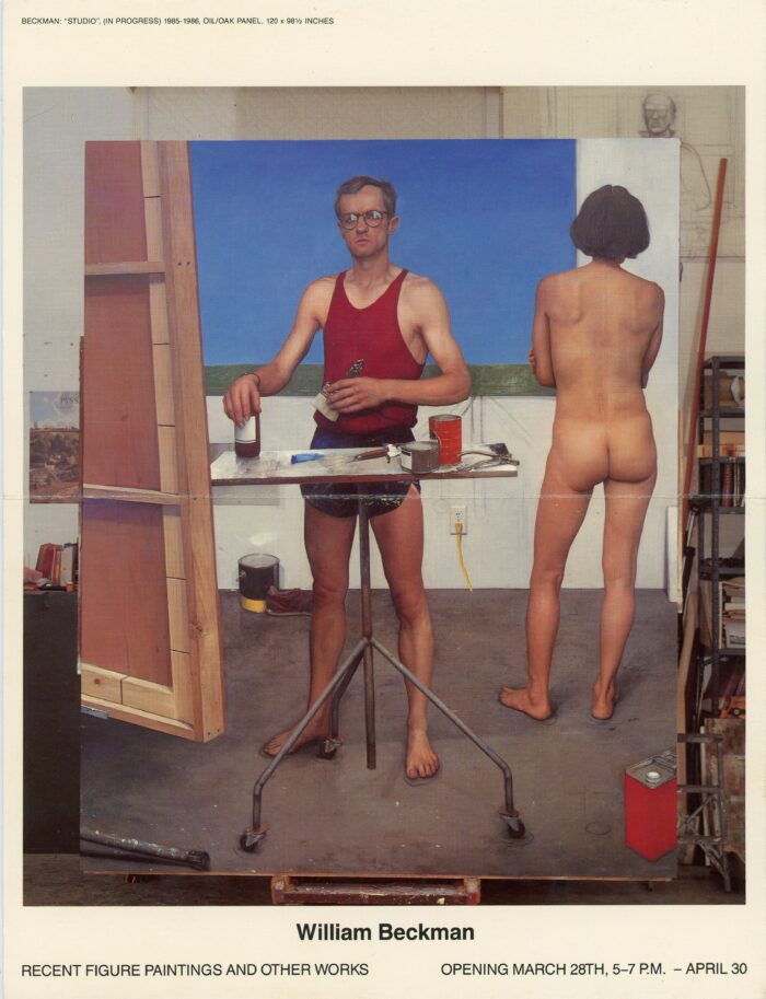 Folded announcement card for an exhibition of figure paintings and other works by William Beckman at Allan Frumkin Gallery, March 28 – April 30, 1985.