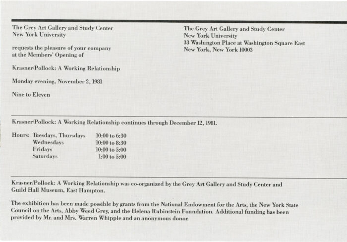Foldout card for an exhibition at NYU’s Grey Art Gallery entitled Krasner/Pollock: A Working Relationship, November 2 – December 12, 1981.