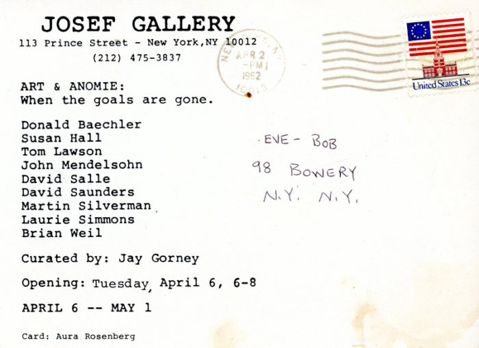 Card for exhibition Art & Anomie at Josef Gallery, Curated by Jay Gorney, featuring works by Donald Baechler, David Salle, Laurie Simmons and others, 1982. Photo by Aura Rosenberg.