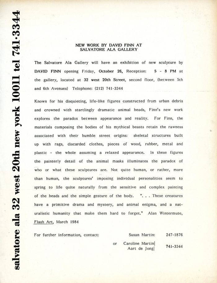 Salvatore Ala Gallery, David Finn, New Work, Card and Press Release, 1984