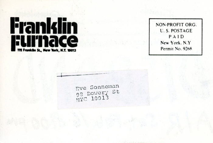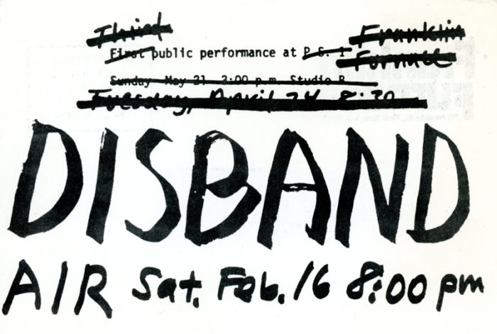 Founded in 1978, Disband was an “all-girl conceptual art punk band” formed by Martha Wilson, Daile Kaplan, and Barbara Ess. Over its 3 year lifespan, Disband’s fluid lineup included Daile Kaplan, Barbara Ess, April Gornik, Barbara Kruger, Ilona Granet, Donna Henes, Diane Torr, Martha Wilson, and writer Ingrid Sischy. These two cards frugally advertise performances at P.S.1 and A.I.R. reusing cards for earlier public performances.