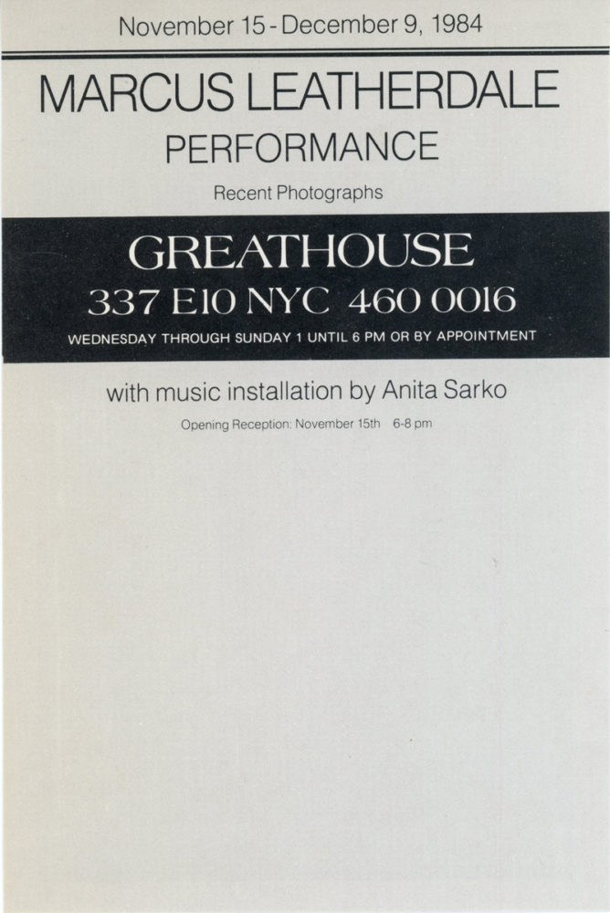 Greathouse Gallery, Marcus Leatherdale, Recent Photographs, Card, 1984. With music installation by Anita Sarko.