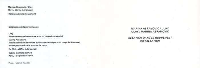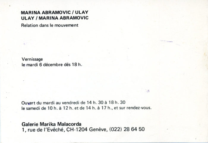 Marina Abramovic, Ulay, Relation Dans Le Mouvement, Galerie Marika Malacorda, Folded Card, 1977