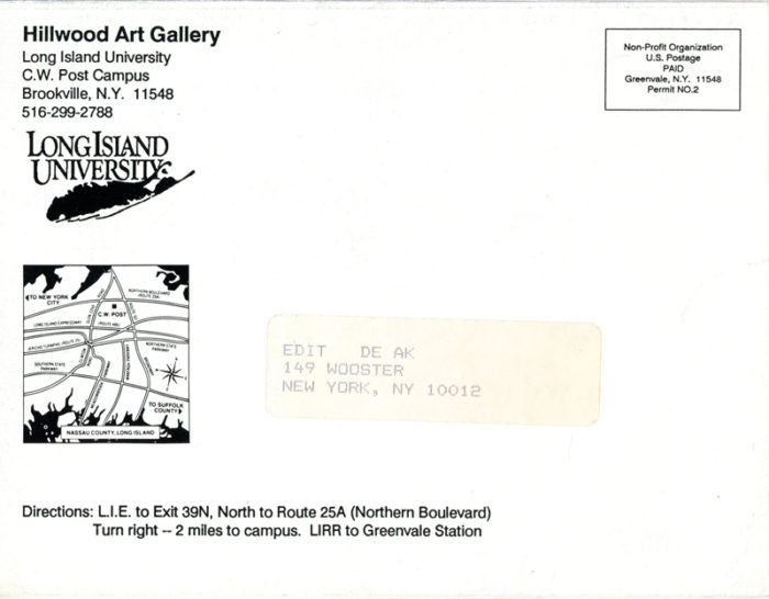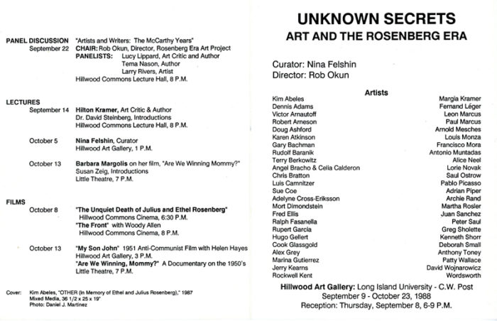 Hilllwood Gallery, Art and the Rosenberg Era, Wojnarovicz, Alice Neel, Arian Piper, Alex Grey, Sue Coe, Among others, Folded Card, 1988.