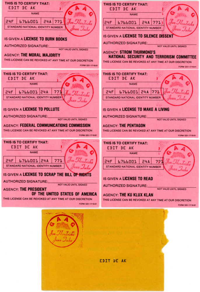 Guerrilla Art Action Group (GAAG), Jon Hendricks, Jean Toche, 10 business card-sized licenses with rubber stamp in envelope addressed to art critic Edit DeAk, 1981. 6 of the 10 licenses are illustrated below.