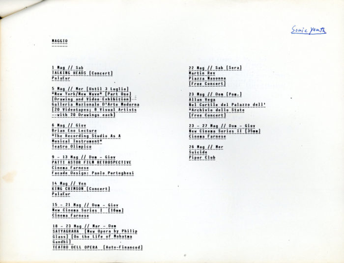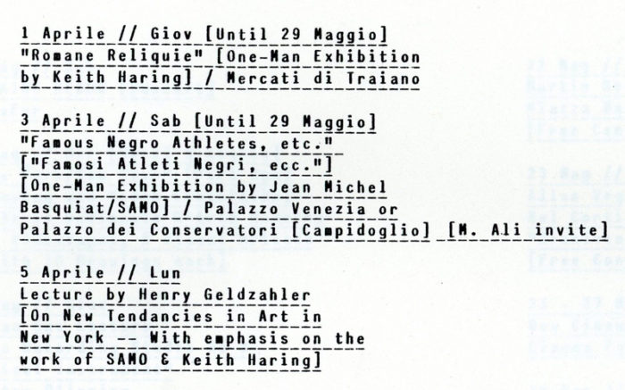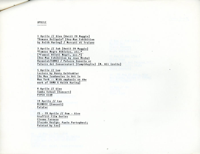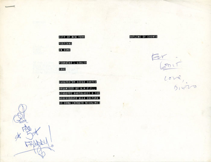 Diego Cortez, Proposal for New York Festival In Rome, inscribed to Edit DeAK by Diego with Fab 5 Freddy tag. Xerox, 5-pages, stapled, 1982